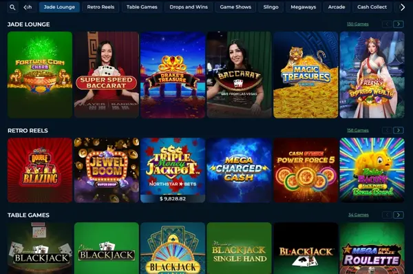 - Autres catégories : Slingo, Arcade, Game Shows, Cash Collect, Fire Blaze et collections de jackpots.