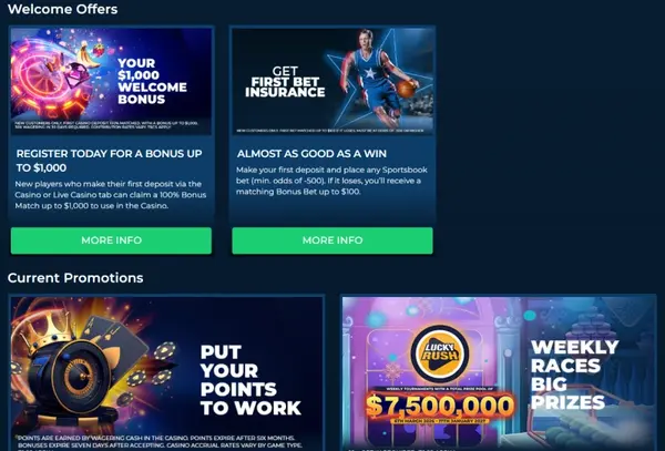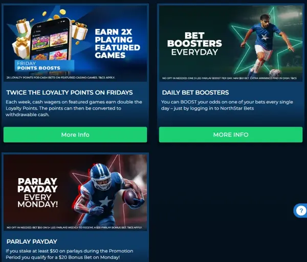 NorthStar Casino récompense le jeu continu via un programme de fidélité qui attribue des points pour chaque dollar misé au casino. Vous pouvez échanger vos points contre du cash ou des paris bonus sportifs, et suivre votre progression dans votre compte. En montant de niveau, les récompenses peuvent être converties plus rapidement et les avantages deviennent plus flexibles.