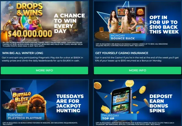 Nos promos régulières sur le Casino NorthStarBets sont conçues pour être simples à comprendre et rapides à activer. La plupart des promos casino sont basées sur dépôt et affichent leurs exigences à l'avance, y compris le dépôt minimum et les jeux éligibles. NorthStar propose aussi des récompenses axées sur les jeux de table, comme des gains de jetons de roulette liés à des résultats précis. Ces offres conviennent bien si vous aimez des sessions structurées avec des objectifs clairs.